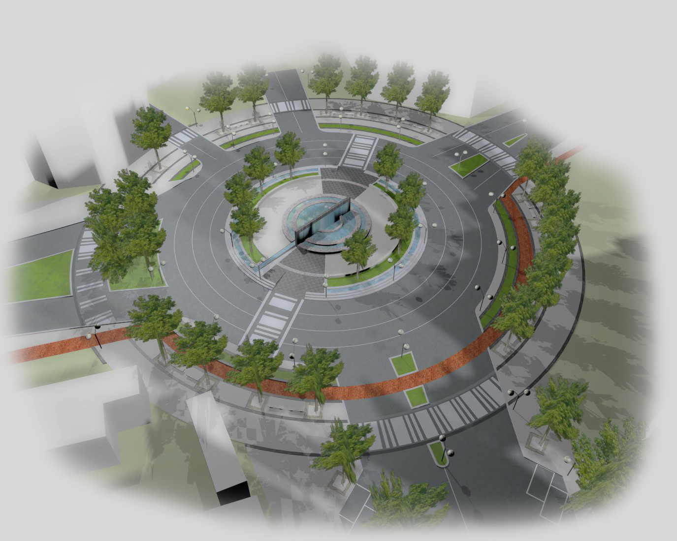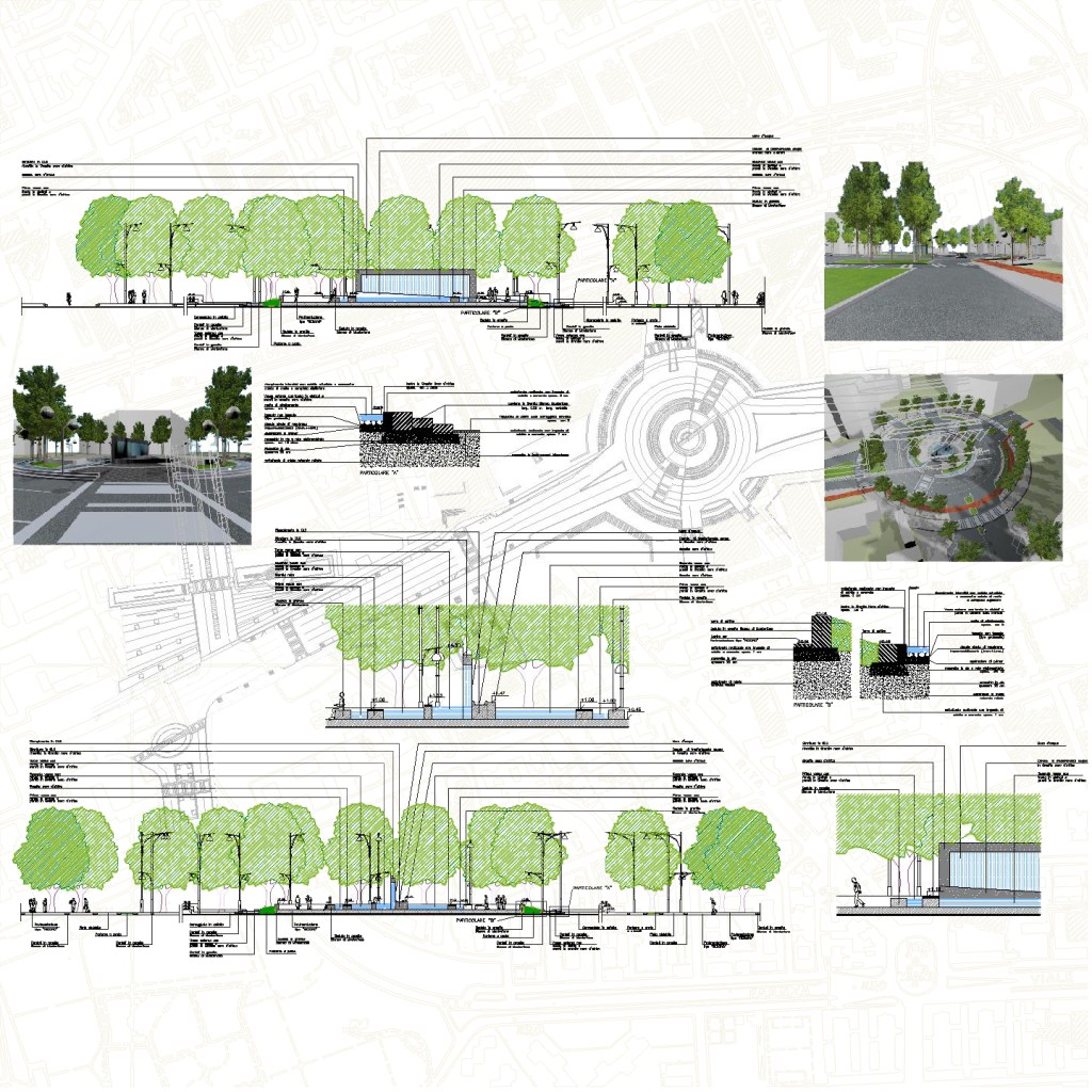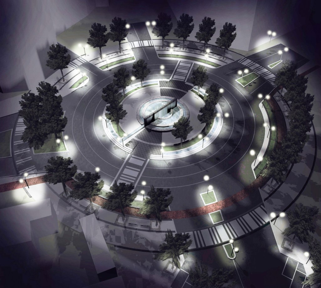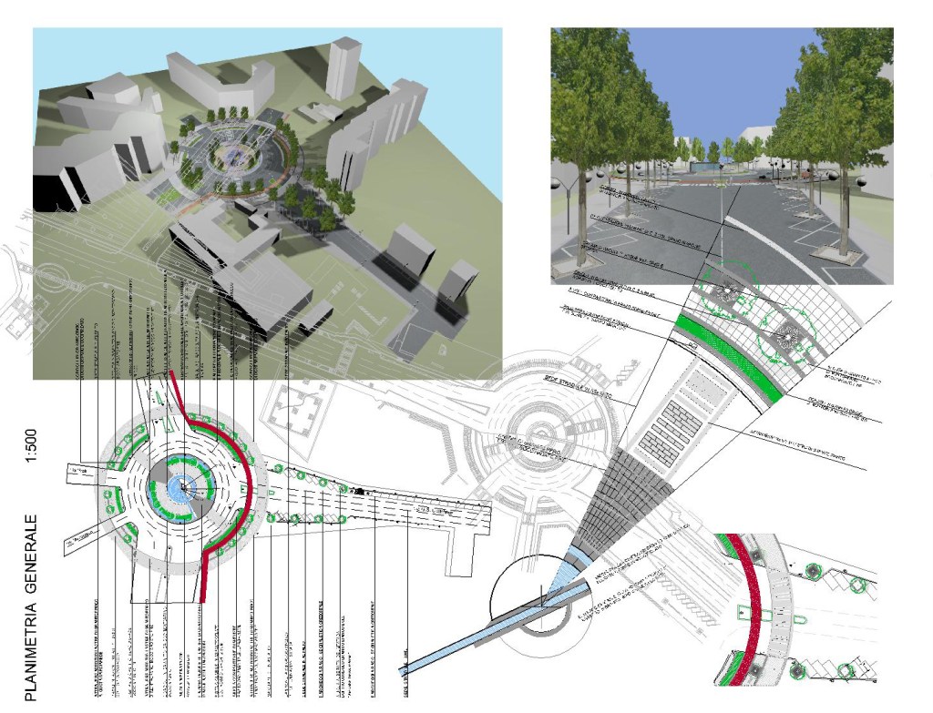 La viabilità è stata risolta attraverso un anello circolare stradale-viabilistico da cui si dipartono le cinque diverse vie, attraversato in senso trasversale da un unico passaggio per pedoni lungo l’asse sud-est, nord-ovest. La realizzazione è pensata attraverso l’utilizzo di materiali in uso costante nella città di Milano: granito bianco e grigio di Montorfano per cordoli, panchine e lastre di pavimentazione; rivestimento in granito “nero Africa” lucido per la fontana. Ippocastani per il verde delle alberature, in continuità con quelli esistenti in Via S.Rita da Cascia.