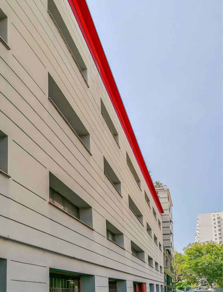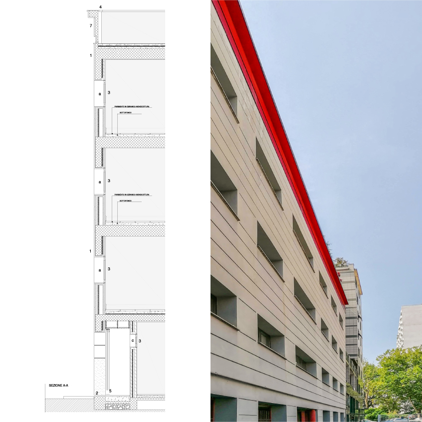 L’edificio presenta 4 piani fuori terra adibiti ad uffici ed attività socio culturali; la superficie lorda di ogni piano è pari a circa 350 m2. Il piano terra progettato come una grande galleria pedonale che collega tutto il complesso e funge da ingresso principale, comprende posti auto, portineria, atrio, locali tecnici e servizi annessi. I restanti piani, sono resi accessibili da due corpi scala e da un ascensore. Il piano della copertura è adibita a terrazza che potrà essere utilizzata per attività culturali.