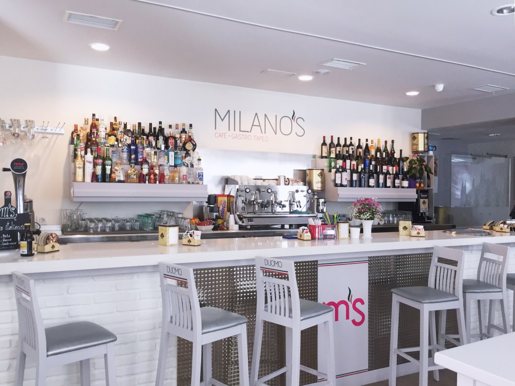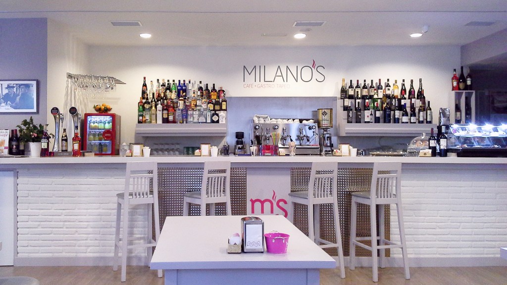 Sono stati studiati e disegnati appositamente alcuni elementi di arredo tra i quali il bancone e i portabottiglie oltre che curata la grafica del logo Milano’S.