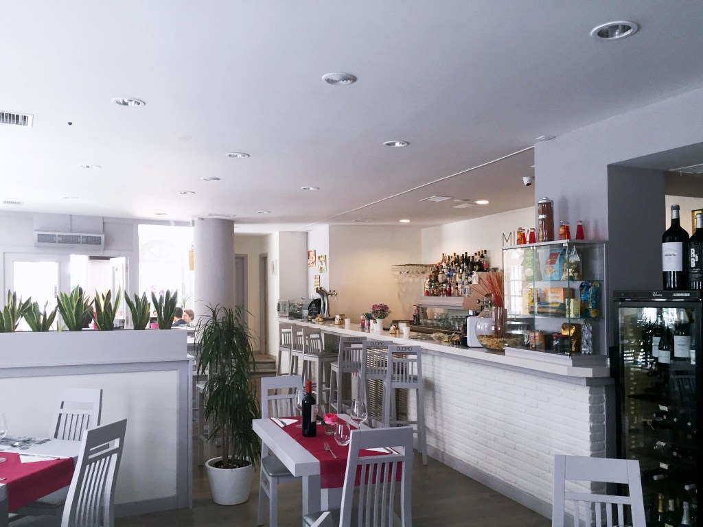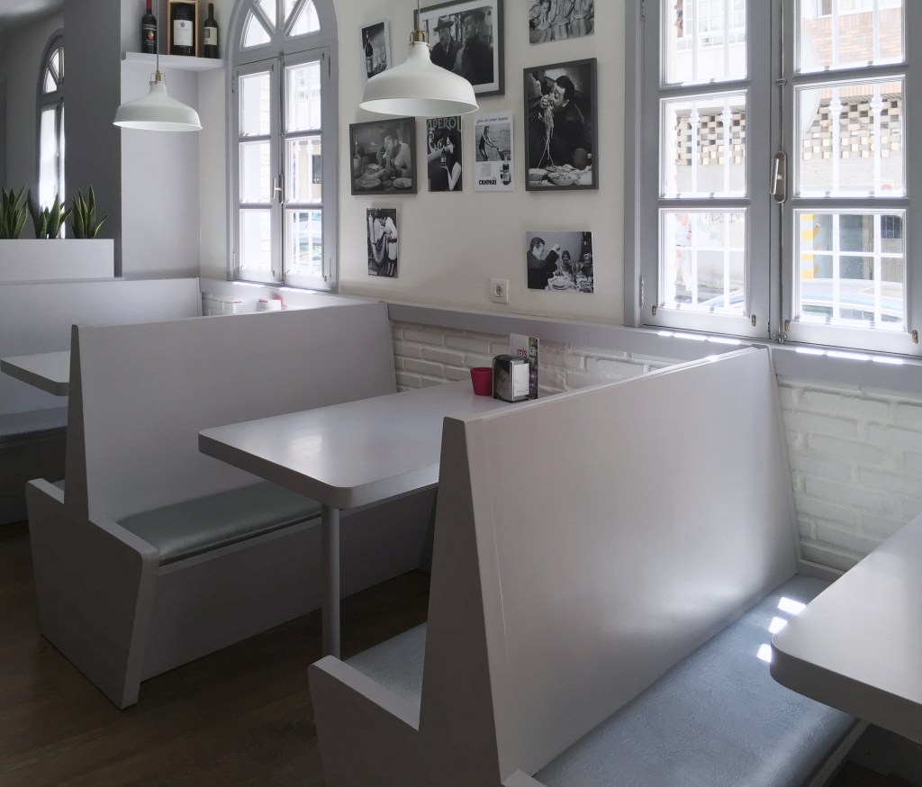 Il locale si sviluppa linearmente seguendo il fronte strada, illuminato da grandi vetrate. L’intera immagine del ristorante è concepita per dare armonia e ariosità all’ambiente utilizzando cromie tenui.