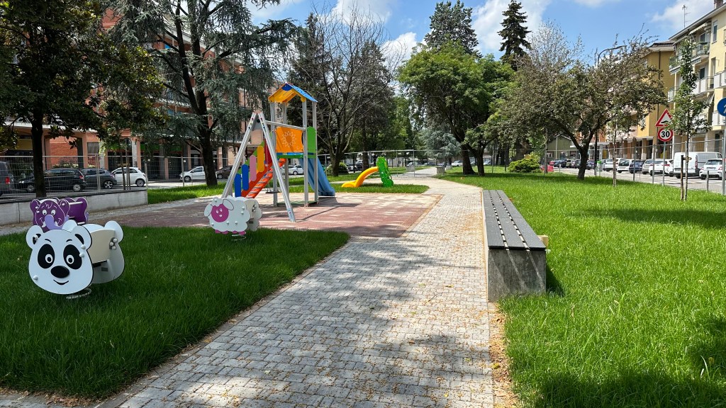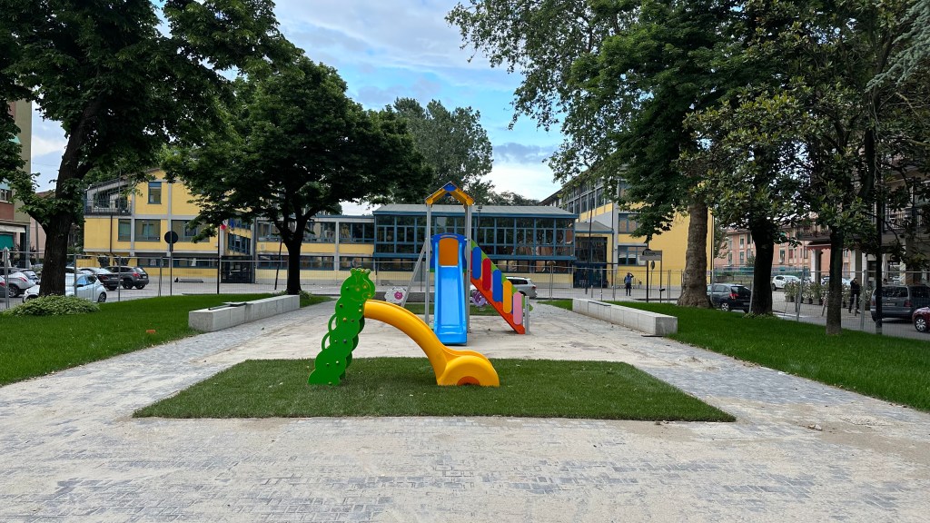 persone diversamente abili. Le attrezzature per il gioco sono state sostituite, e la piazza è stata dotata di impianto di irrigazione per il mantenimento del verde e di videosorveglianza per garantire la sicurezza.