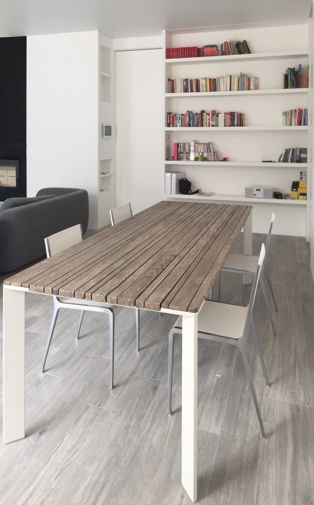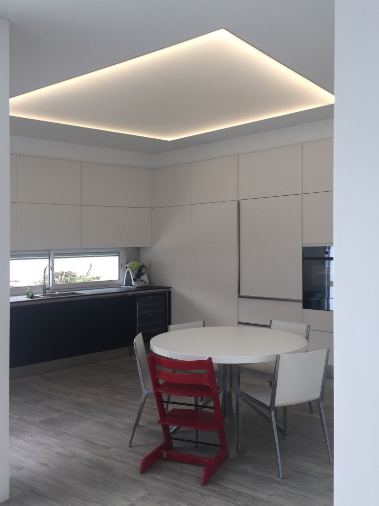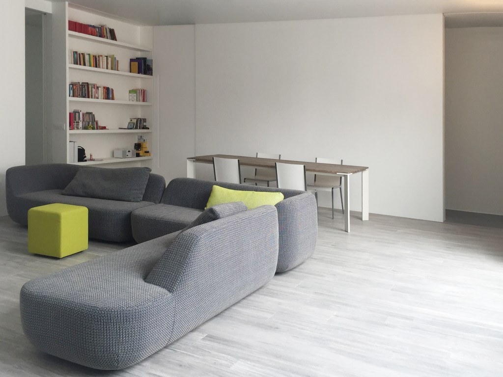 Gli interni sono stati disegnati con arredi su misura e pareti attrezzate. I vari ambienti sono caratterizzati da grandi vetrate che creano permeabilità con il giardino e portano all’interno una notevole luminosità.