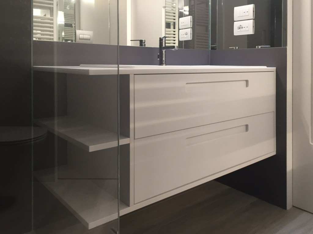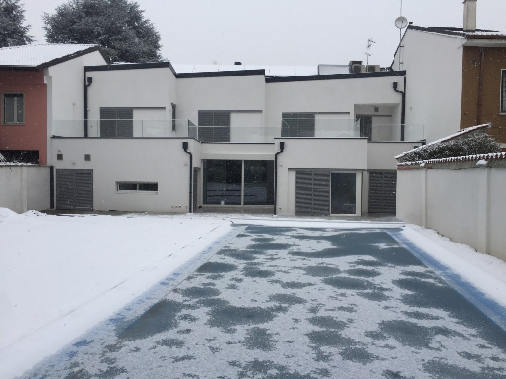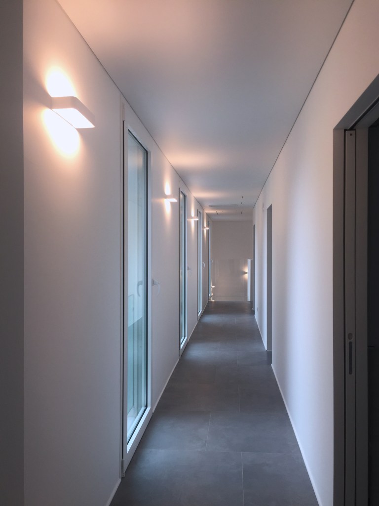 Su strada il prospetto con pannelli lapidei scuri al piano terra va in contrasto con l’intonaco bianco del primo piano dando dinamicità alla facciata e mantenendo l’allineamento della cortina edilizia.