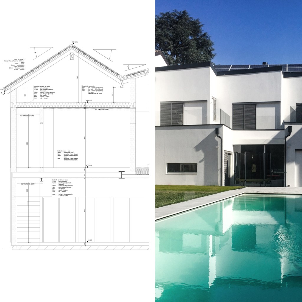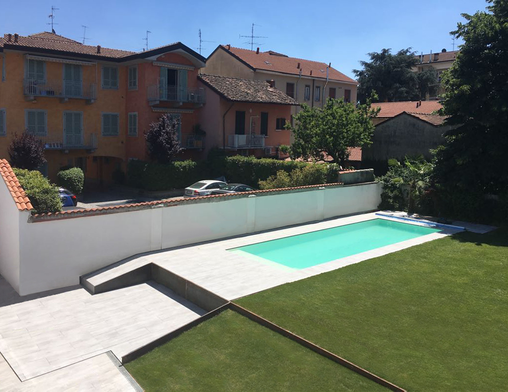 Nel giardino è presente la piscina e sono celate sotto il prato le cisterne per la raccolta delle acque. I cambi di quota tra area pavimentata e area verde crea zone per la socialità.